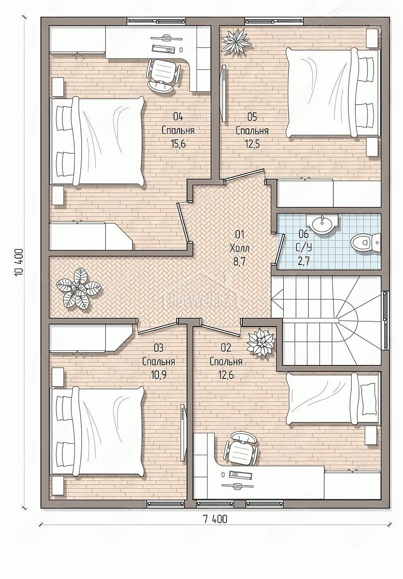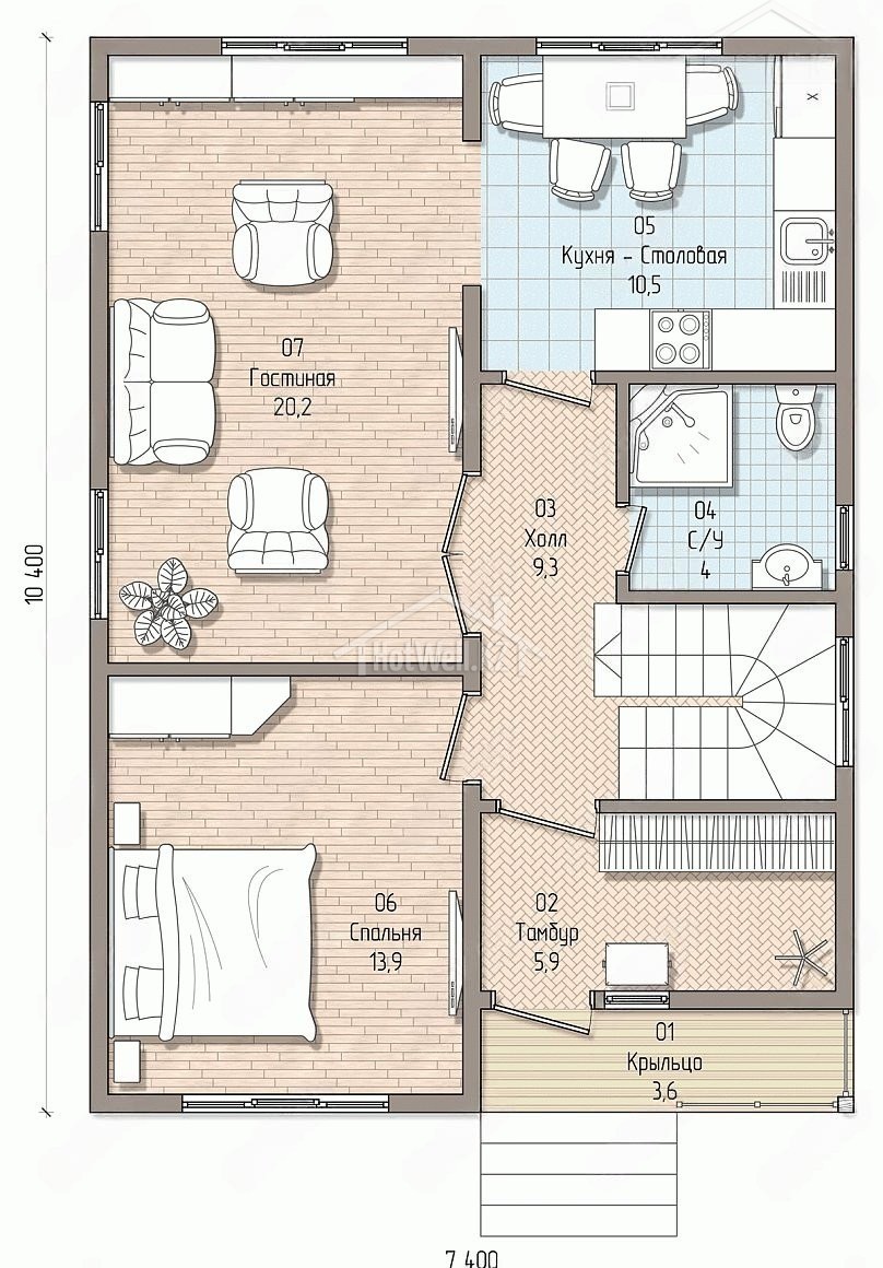 Дом с мансардой 10 на 7 метров, общей площадью 154 м2, из СИП панелей, со спальней на первом этаже.