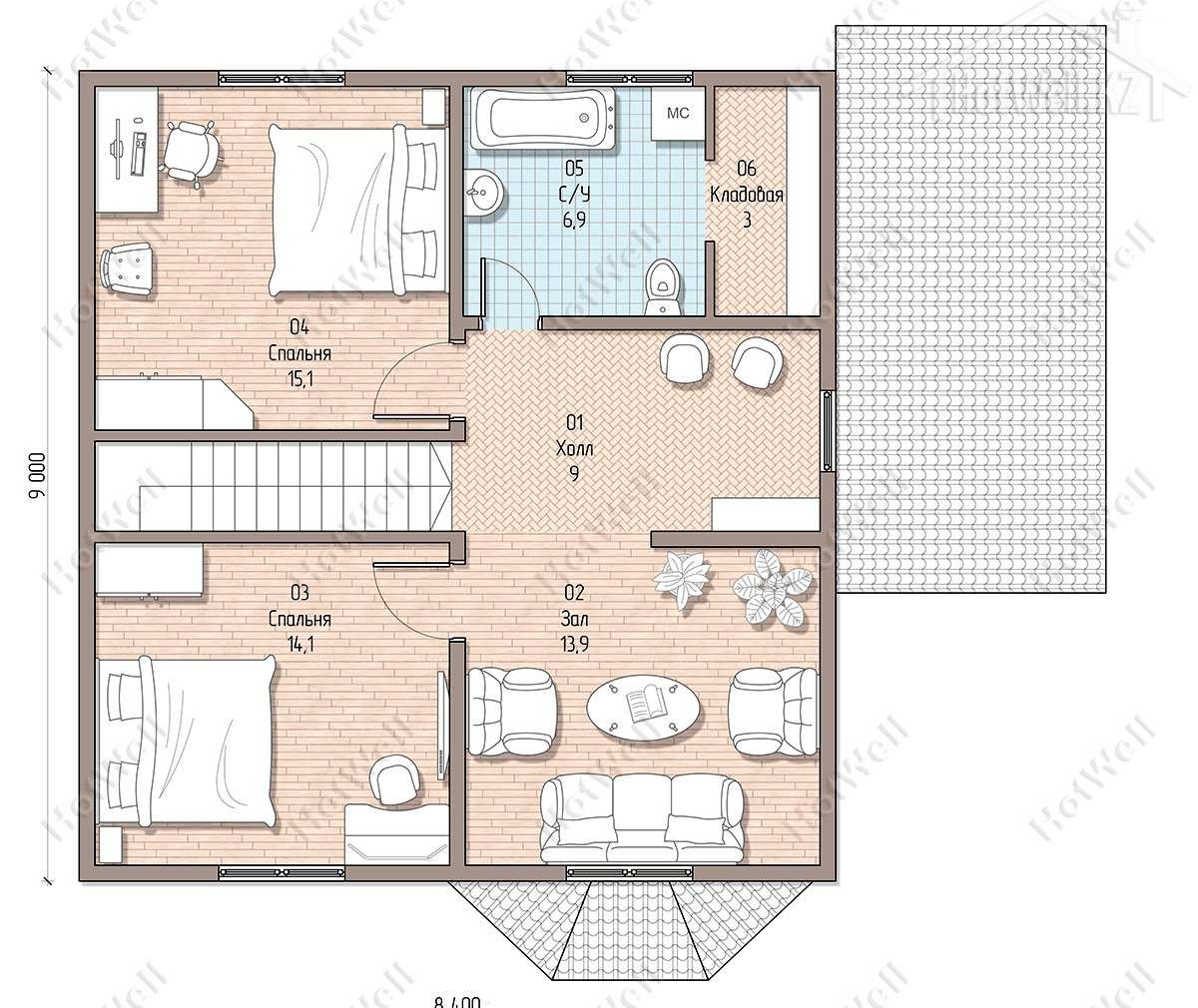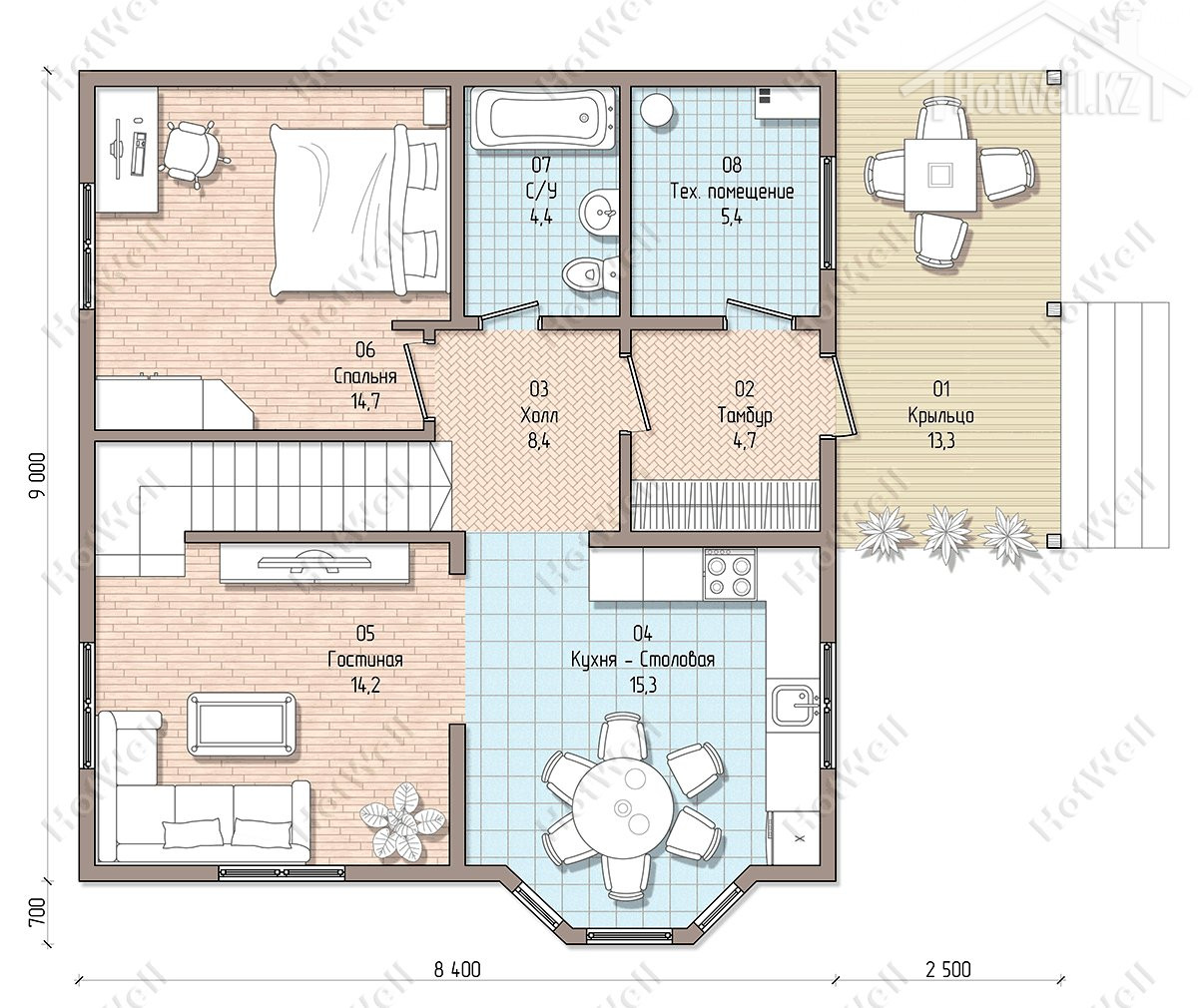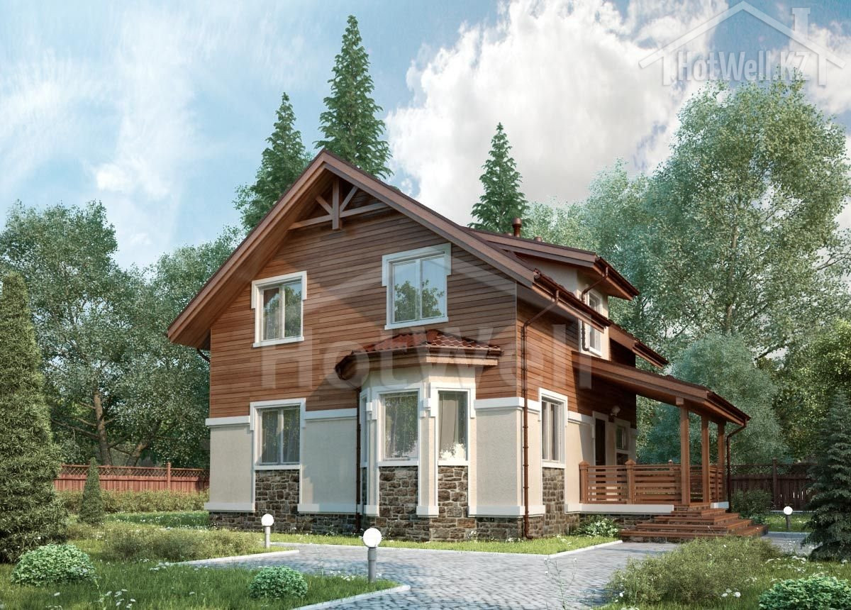 Дом с мансардой 11 на 10 метров, общей площадью 166 м2, из СИП панелей, с эркером и спальней на первом этаже.