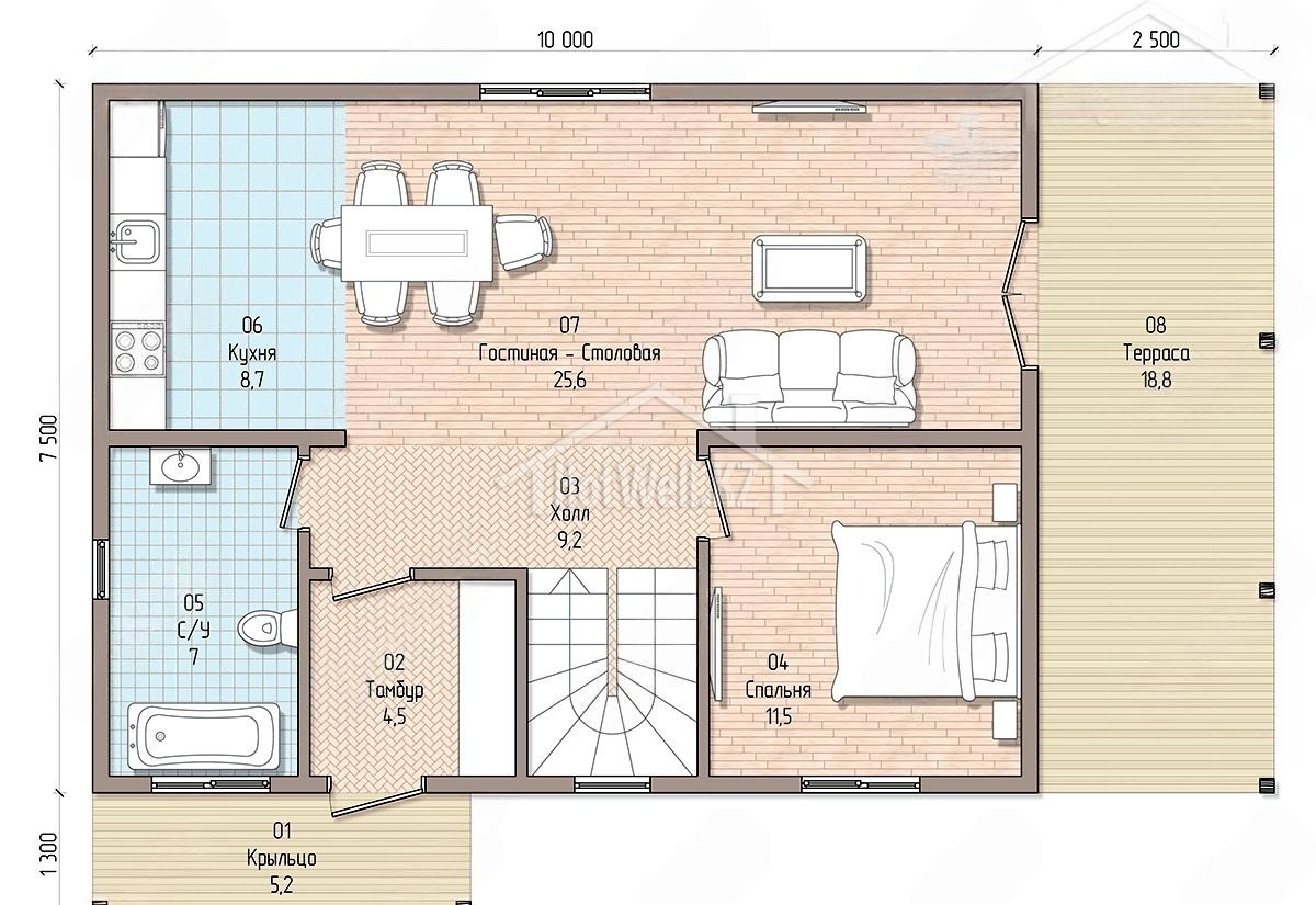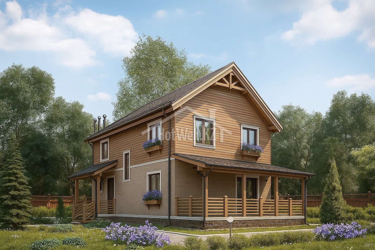 Двухэтажный дом 9 на 13 метров, общей площадью 174 м2, из СИП панелей, с террасой и спальней на первом этаже.