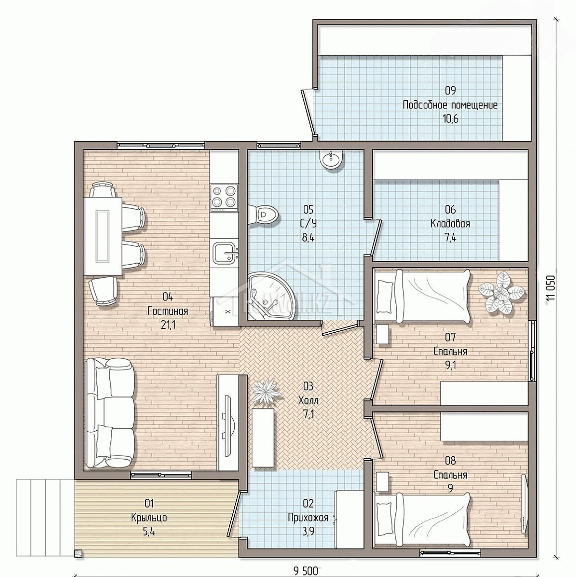 Одноэтажный дом 11 на 9 метров, общей площадью 93 м2, из СИП панелей, со спальней на первом этаже.