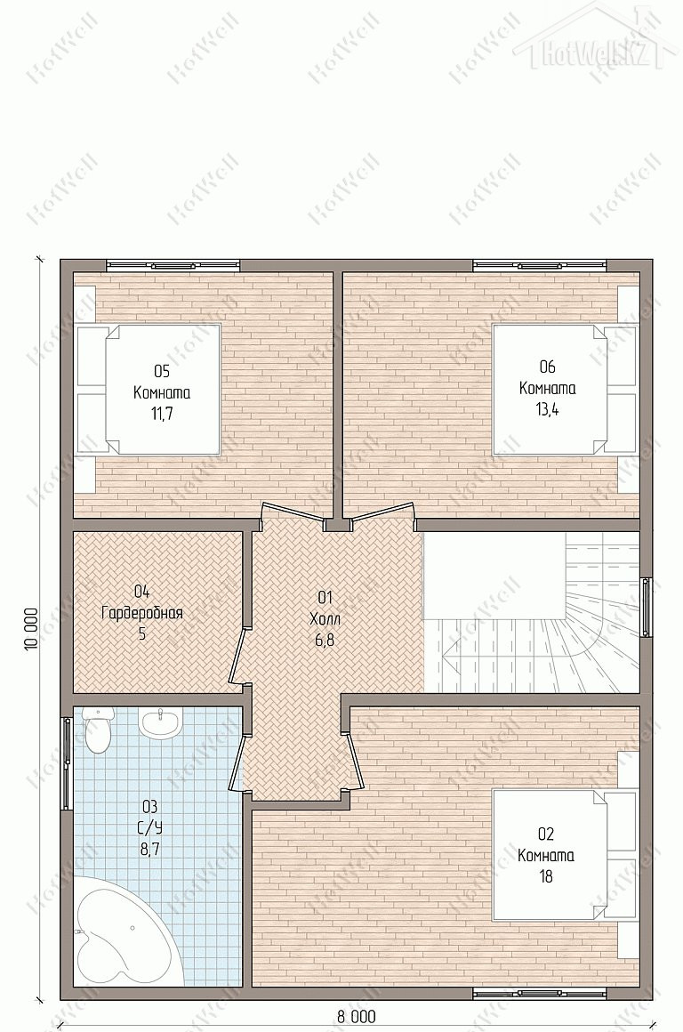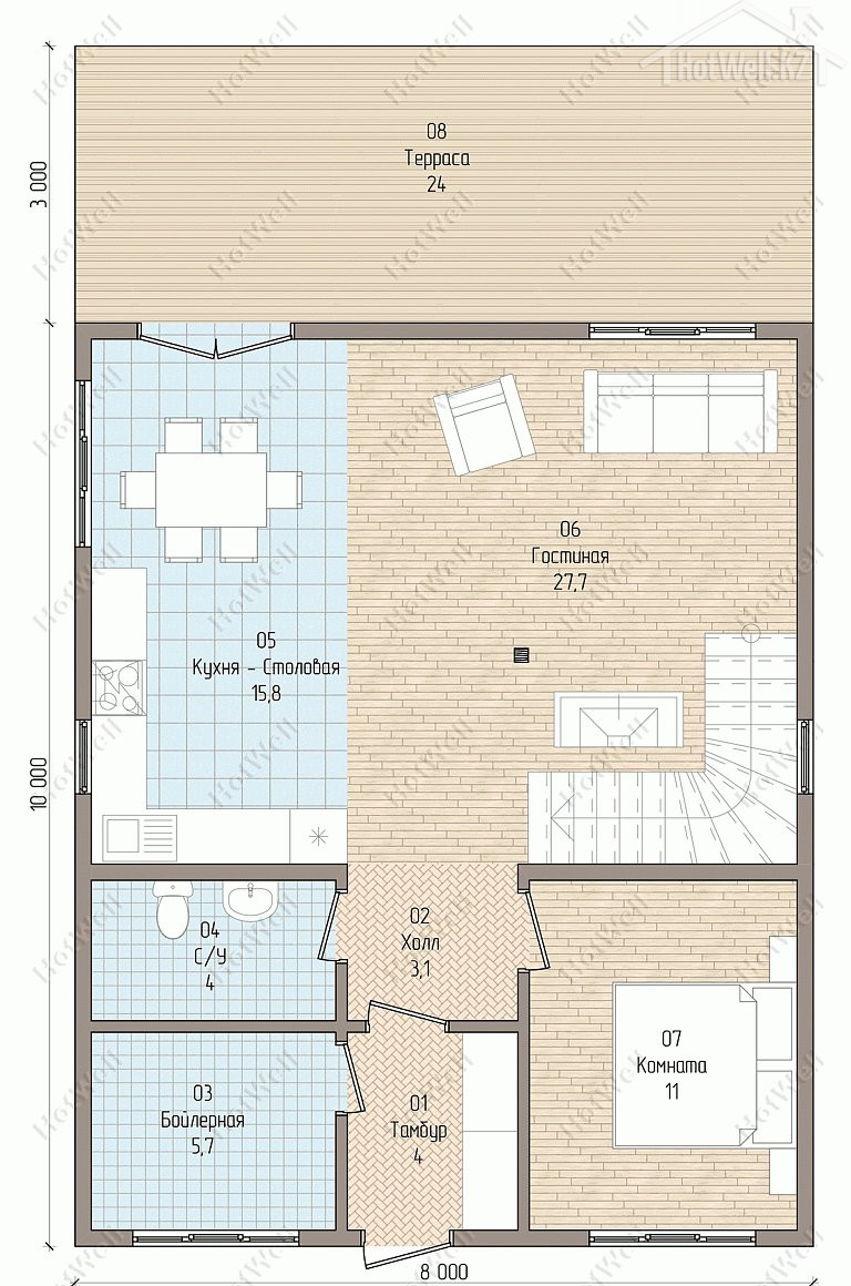 Двухэтажный дом 13 на 8 метров, общей площадью 184 м2, из СИП панелей, с бойлерной, террасой и спальней на первом этаже.