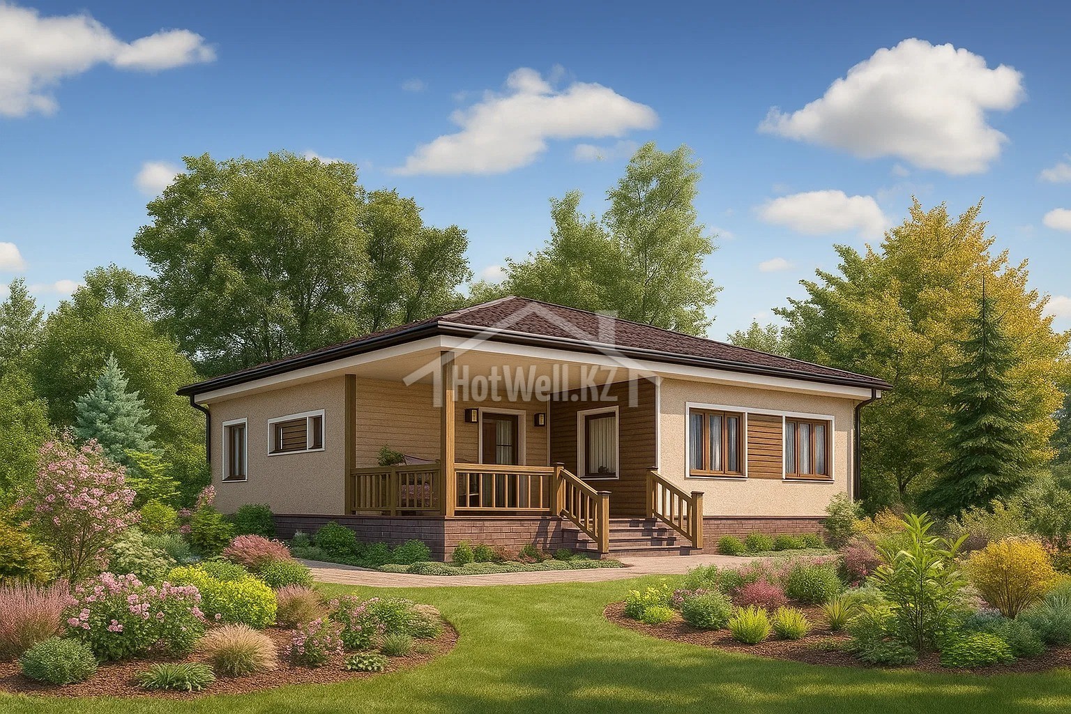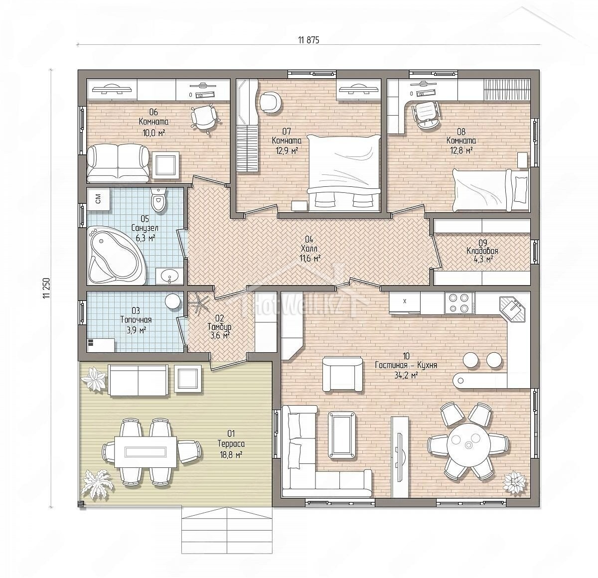 Одноэтажный дом 12 на 11 метров, общей площадью 134 м2, из СИП панелей, с бойлерной, террасой и спальней на первом этаже.