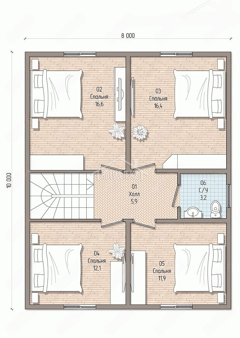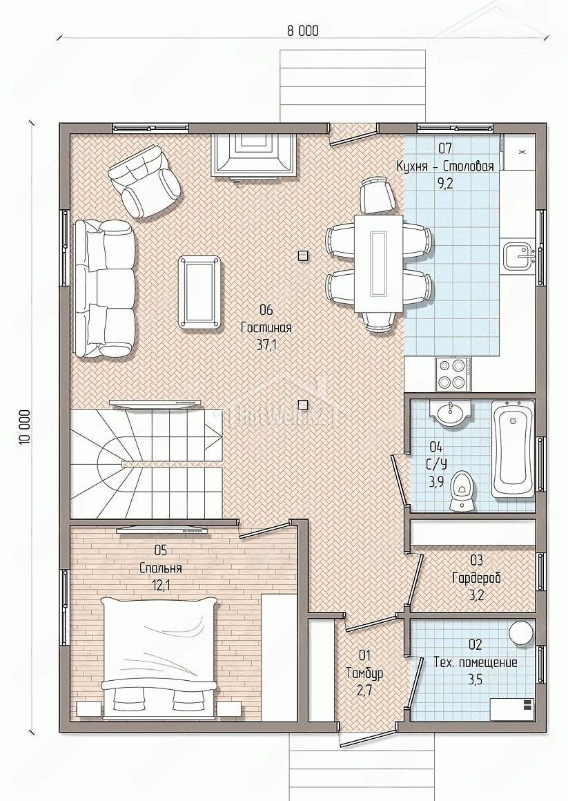Дом с мансардой 10 на 8 метров, общей площадью 160 м2, из СИП панелей, с бойлерной и спальней на первом этаже.