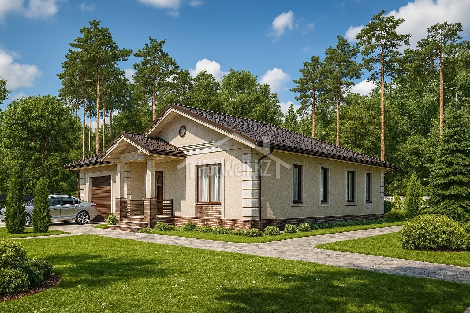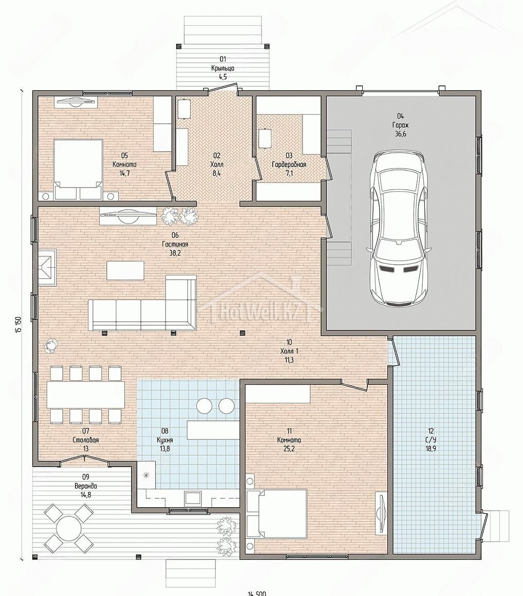 Одноэтажный дом 17 на 15 метров, общей площадью 224 м2, из СИП панелей, с гаражом, террасой и спальней на первом этаже.