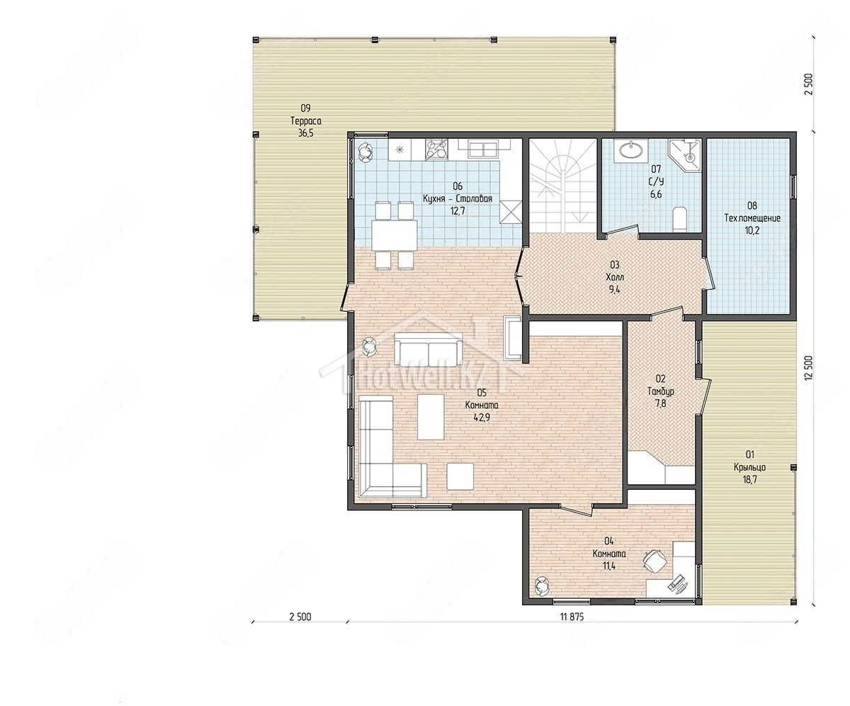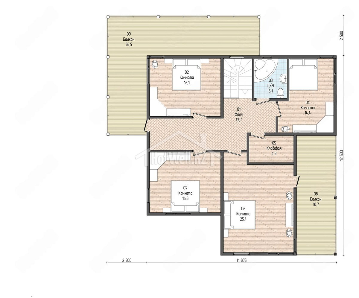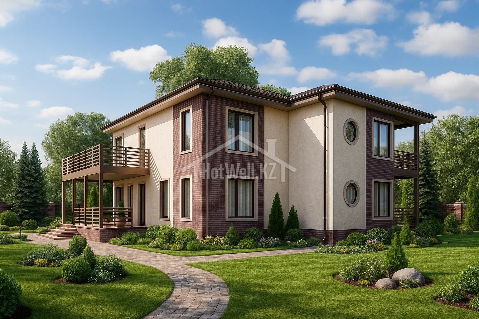 Двухэтажный дом 15 на 14 метров, общей площадью 347 м2, из СИП панелей, с бойлерной, террасой, балконом и спальней на первом этаже.