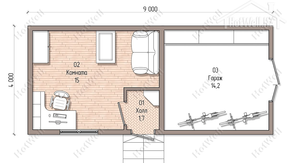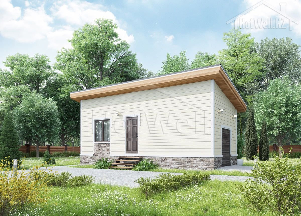 Одноэтажный гараж 9 на 4 метров, общей площадью 36 м2, из СИП панелей, со спальней на первом этаже.