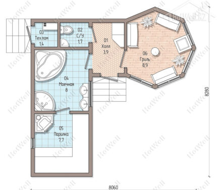 Одноэтажная баня 8 на 6 метров, общей площадью 39 м2, из СИП панелей, с сауной и бойлерной.