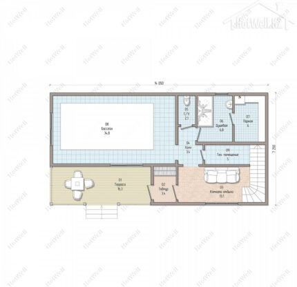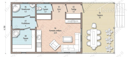 Одноэтажная баня 13 на 6 метров, общей площадью 79 м2, из СИП панелей, с сауной и террасой.
