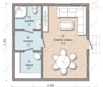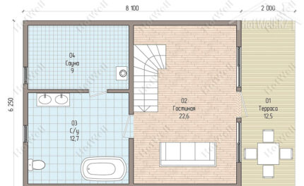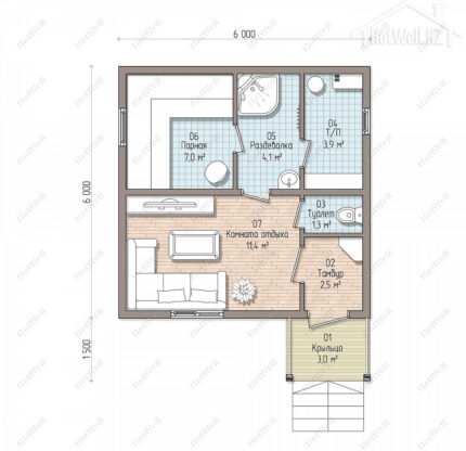Одноэтажная баня 6 на 6 метров, общей площадью 39 м2, из СИП панелей, с сауной.