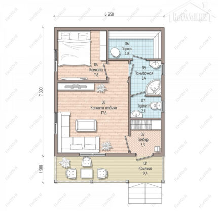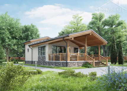 Одноэтажная баня 9 на 6 метров, общей площадью 55 м2, из СИП панелей, с сауной и спальней на первом этаже.