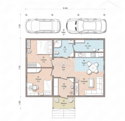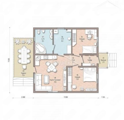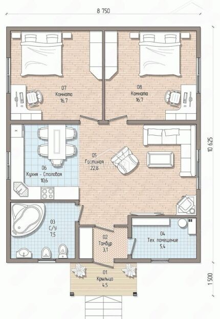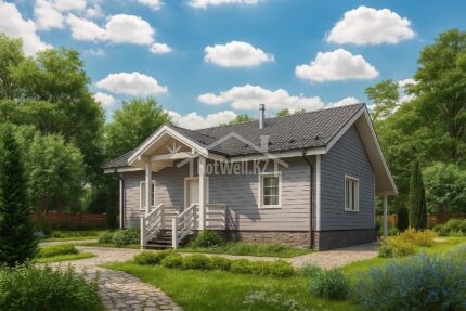 Данный проект дома основан на основе популярного проекта А-100, разница в том что у данного проекта вынесено за пределы дома тех помещение с тамбуром. Проект имеет большую гостинную на первом этаже 22 м2, отдельную кухню. Второй этаж имеет три спальни и сан узел. Тип крыши двускатная. Очень хороший и популярный проект.