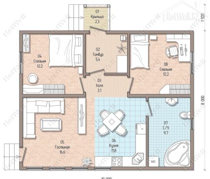 Одноэтажный дом 10 на 10 метров, общей площадью 82 м2, из СИП панелей, со спальней на первом этаже.