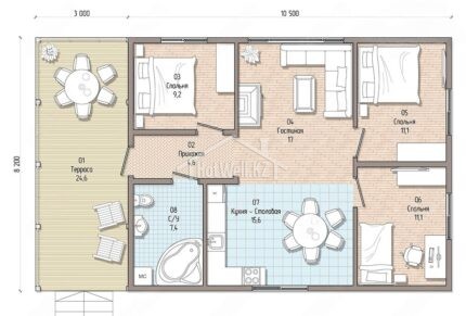 Одноэтажный дом 14 на 8 метров, общей площадью 111 м2, из СИП панелей, с террасой и спальней на первом этаже.