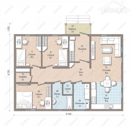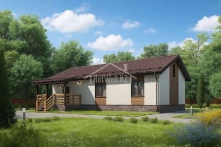 Одноэтажный дом 13 на 12 метров, общей площадью 120 м2, из СИП панелей, с бойлерной и террасой.