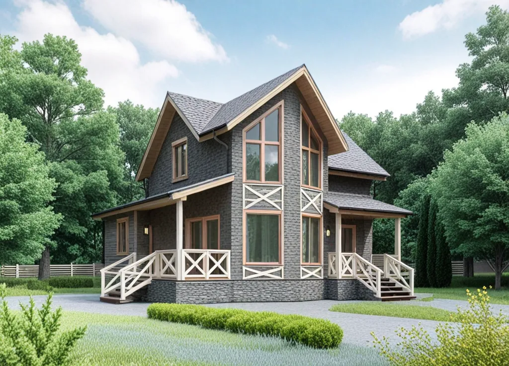 Дом с мансардой 10 на 8 метров, общей площадью 120 м2, из СИП панелей, с бойлерной и террасой.