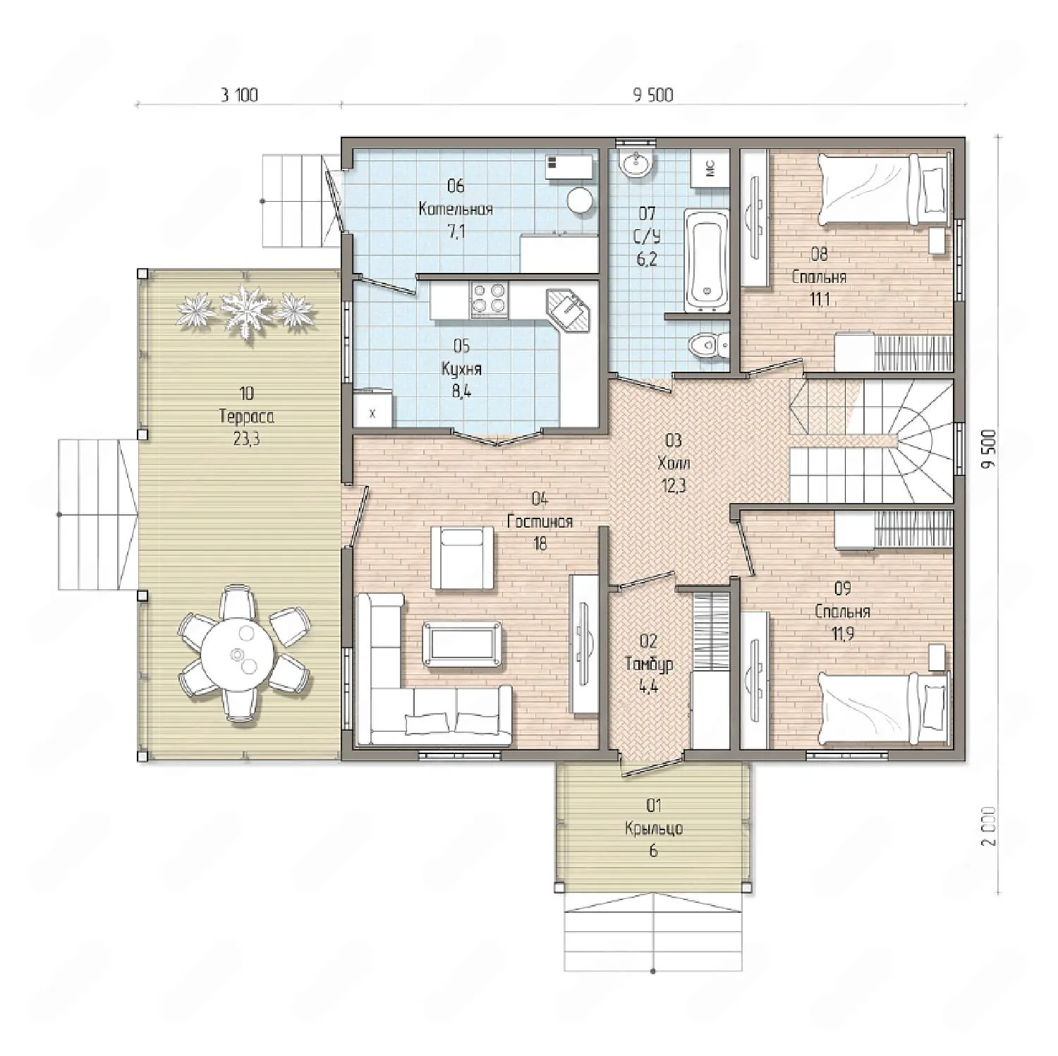 Двухэтажный дом 13 на 12 метров, общей площадью 210 м2, из СИП панелей, с бойлерной, террасой и спальней на первом этаже.