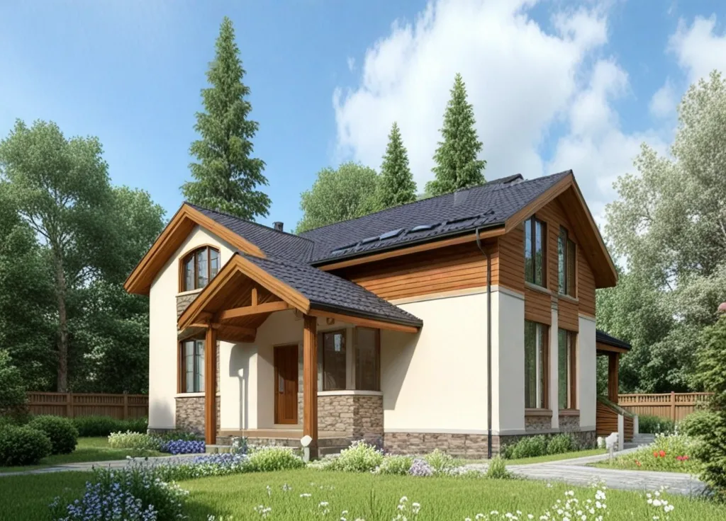 Дом с мансардой 12 на 10 метров, общей площадью 228 м2, из СИП панелей, с террасой.