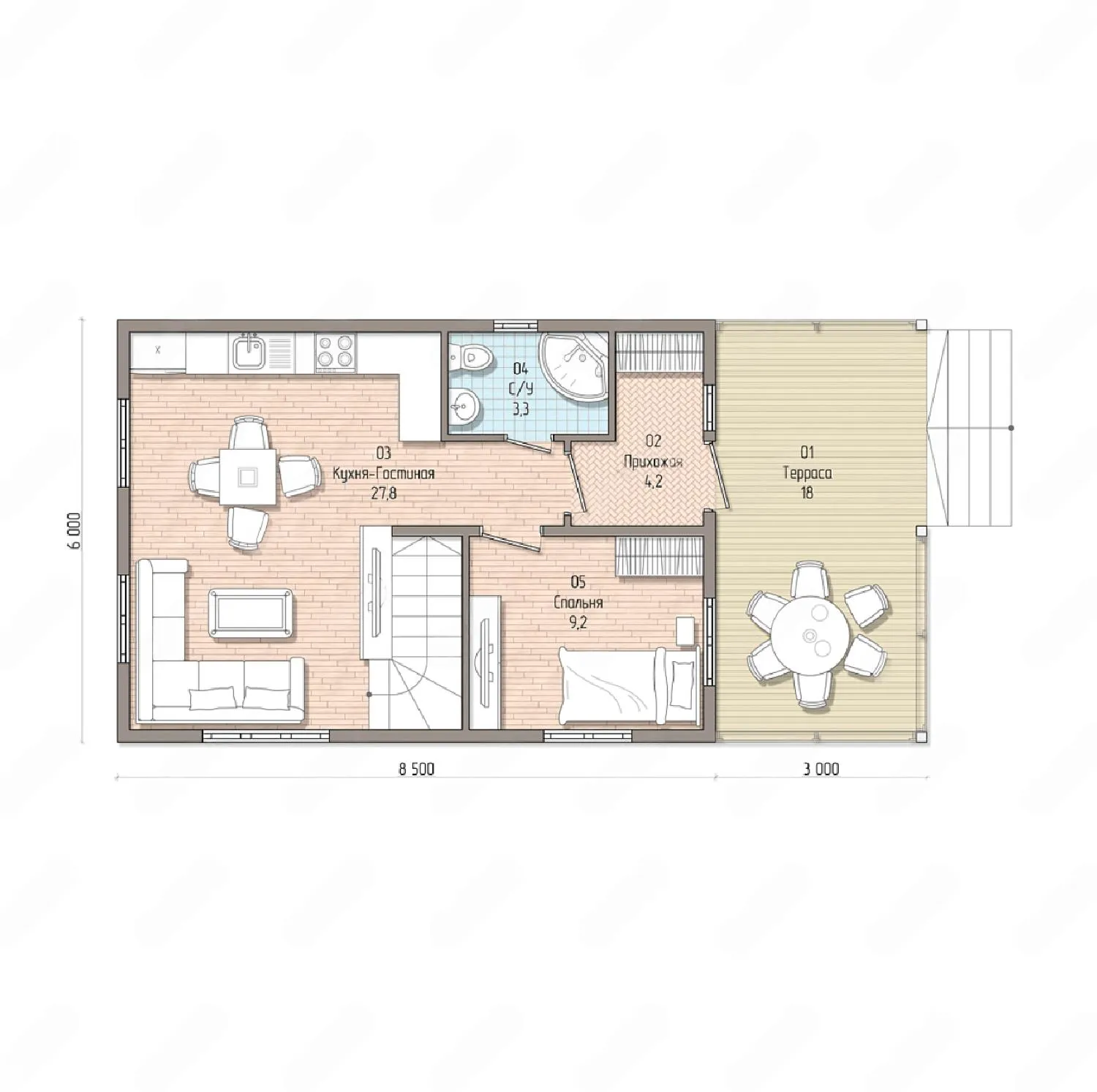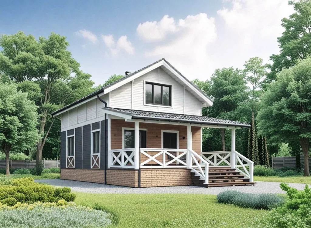 Дом с мансардой 12 на 6 метров, общей площадью 120 м2, из СИП панелей, с террасой и спальней на первом этаже.