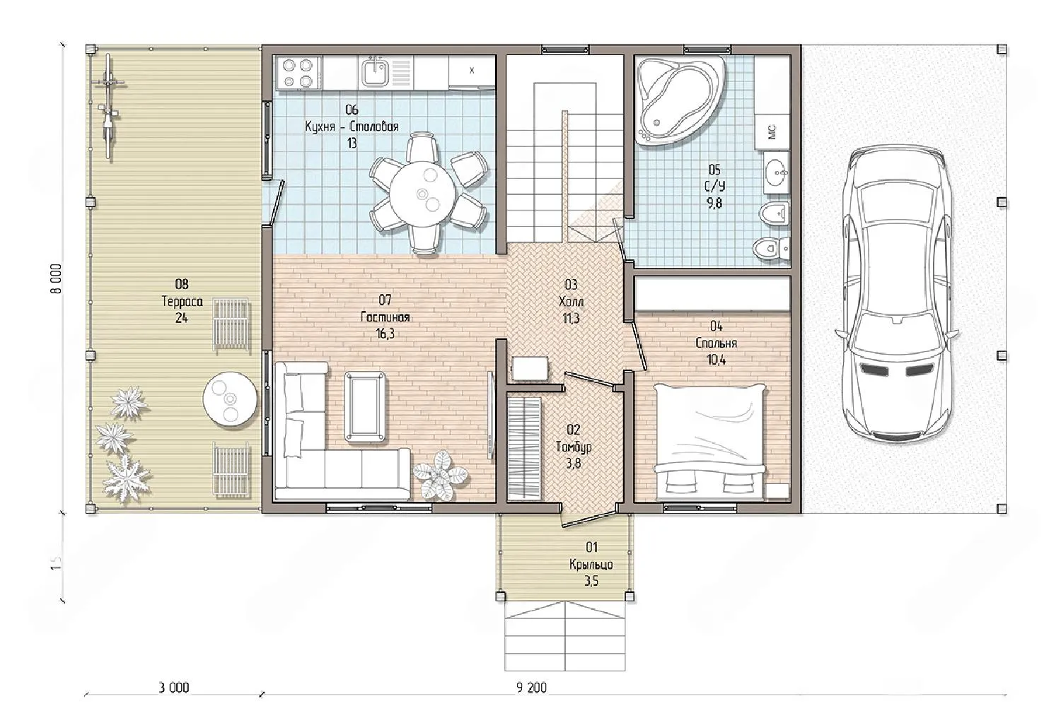 Дом с мансардой 16 на 10 метров, общей площадью 203 м2, из СИП панелей, с навесом, террасой и спальней на первом этаже.