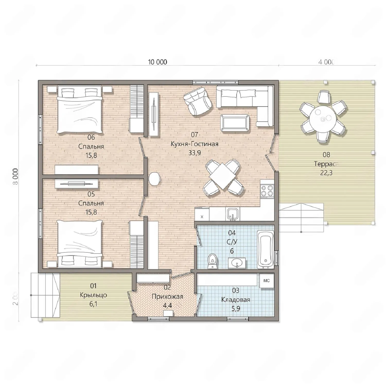 Одноэтажный дом 14 на 10 метров, общей площадью 75 м2, из СИП панелей, с террасой и спальней на первом этаже.