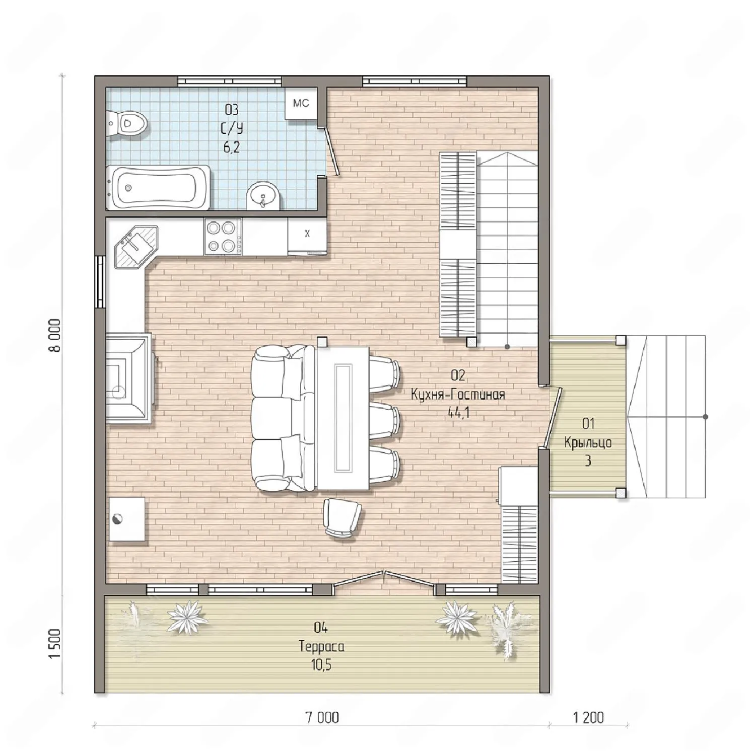Дом с мансардой 10 на 8 метров, общей площадью 125 м2, из СИП панелей, с террасой.
