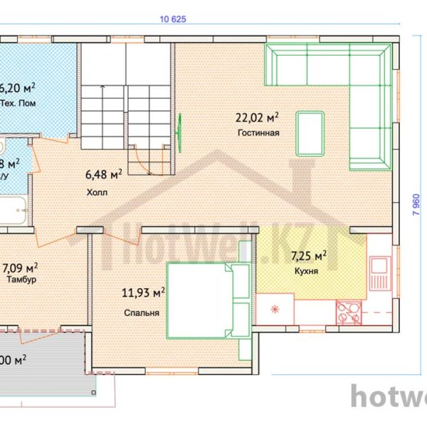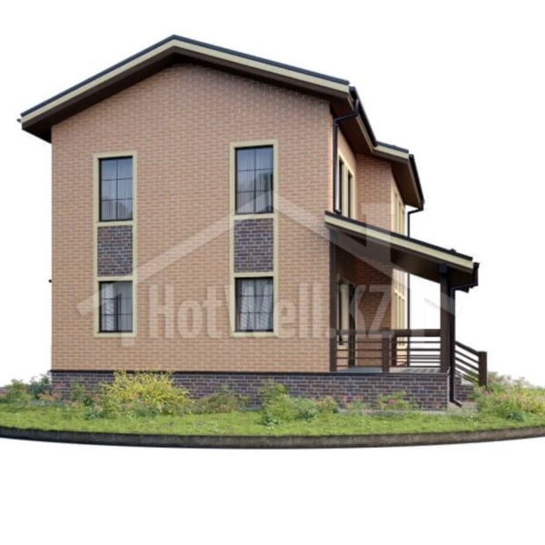 Двухэтажный дом 11 на 10 метров, общей площадью 197 м2, из СИП панелей, с террасой, эркером и спальней на первом этаже.