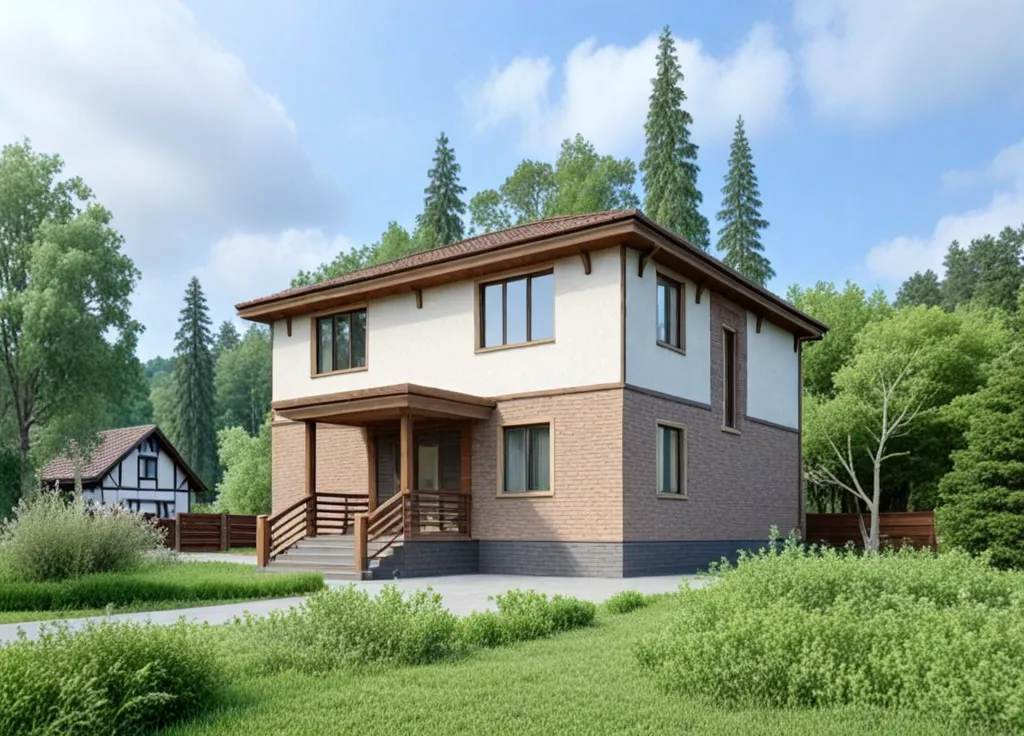 Двухэтажный дом 12 на 10 метров, общей площадью 200 м2, из СИП панелей, со спальней на первом этаже.