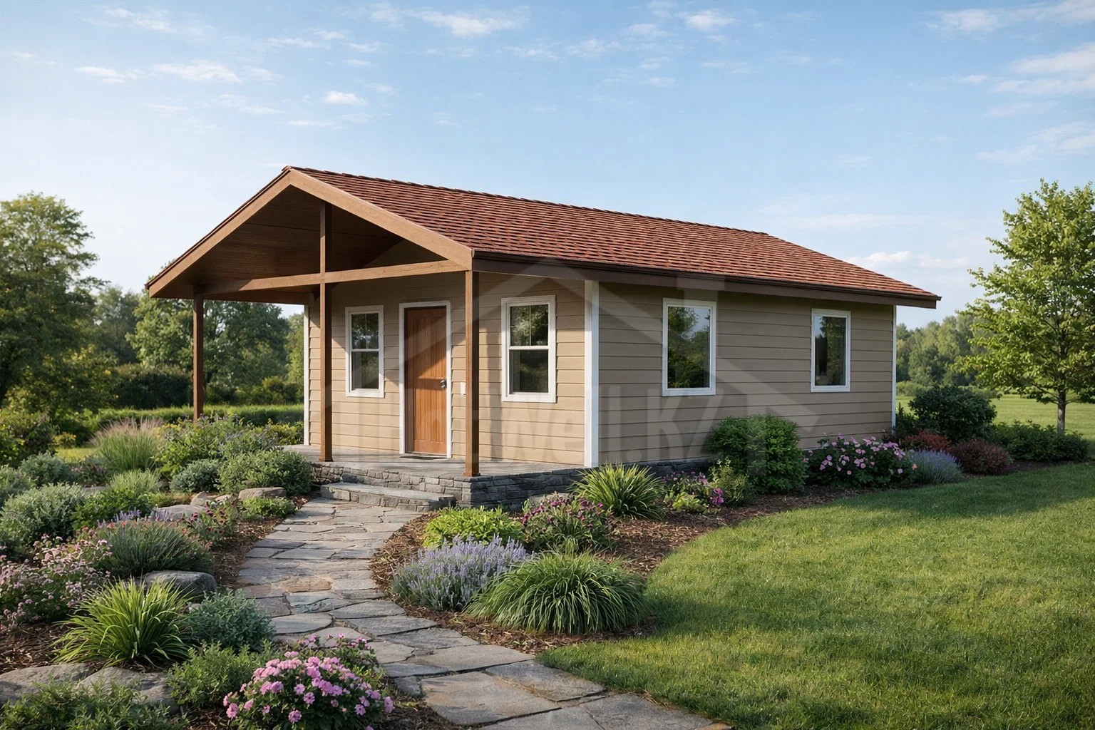 Е-43 — компактный одноэтажный дом площадью 43 м² с классической двускатной крышей. Проект разработан для комфортного проживания 1–2 человек и идеально подходит как дачный дом, гостевой дом или доступное жильё для постоянного проживания. Рациональная планировка позволяет максимально эффективно использовать каждый квадратный метр.
