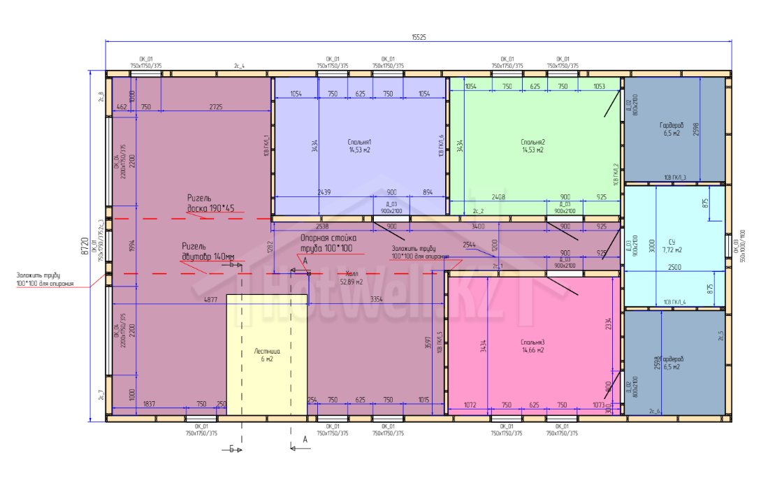 Высота стен 2,6 метра обеспечивает комфортную высоту потолков и позволяет эффективно сохранять тепло внутри дома. Благодаря этому помещения остаются уютными и удобными для повседневной жизни.
