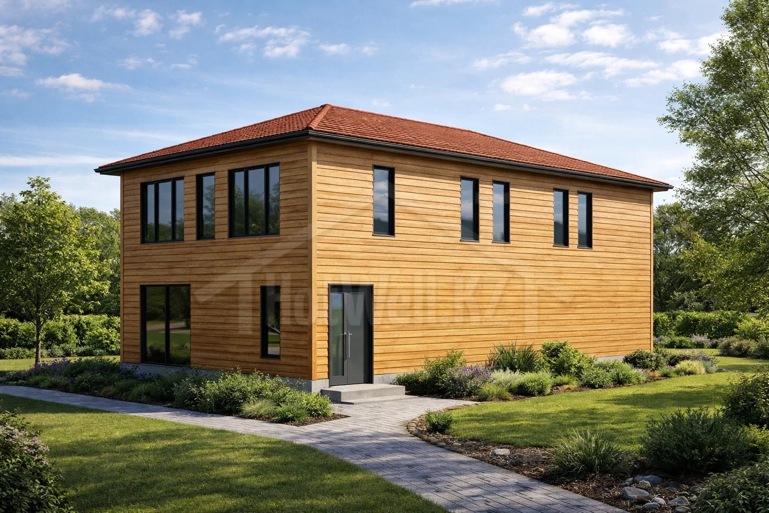 Дом состоит из двух этажей, что позволяет грамотно разделить пространство. На первом этаже обычно располагаются кухня, гостиная и общие зоны, а на втором — спальни и личные комнаты.