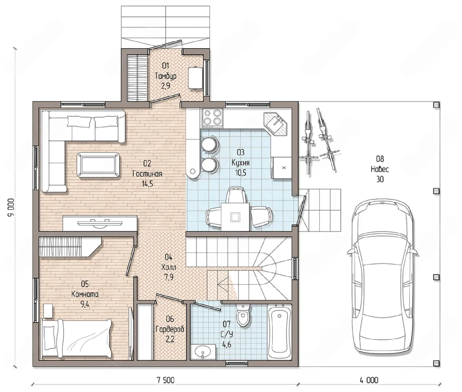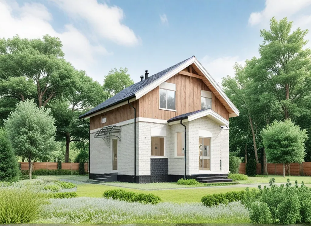 Дом с мансардой 9 на 8 метров, общей площадью 116 м2, из СИП панелей, с навесом и спальней на первом этаже.