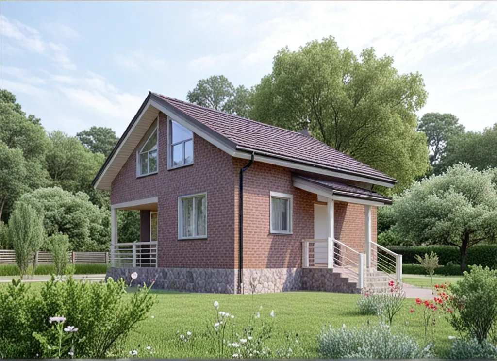 Дом с мансардой 9 на 8 метров, общей площадью 117 м2, из СИП панелей, с террасой и спальней на первом этаже.