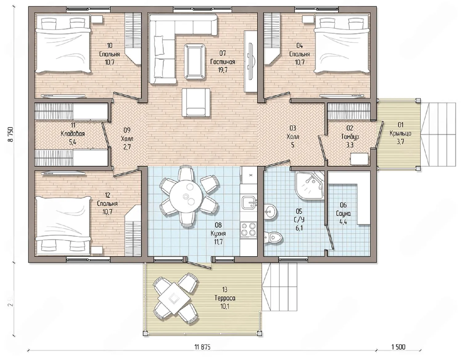 Одноэтажный дом 13 на 11 метров, общей площадью 118 м2, из СИП панелей, с бойлерной, террасой и спальней на первом этаже.