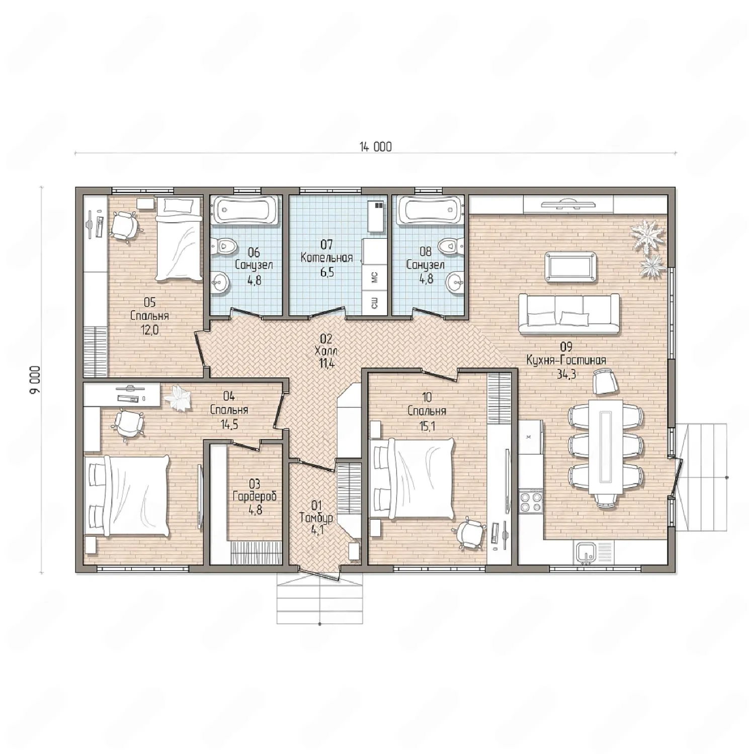 Одноэтажный дом 14 на 9 метров, общей площадью 126 м2, из СИП панелей, с бойлерной и спальней на первом этаже.