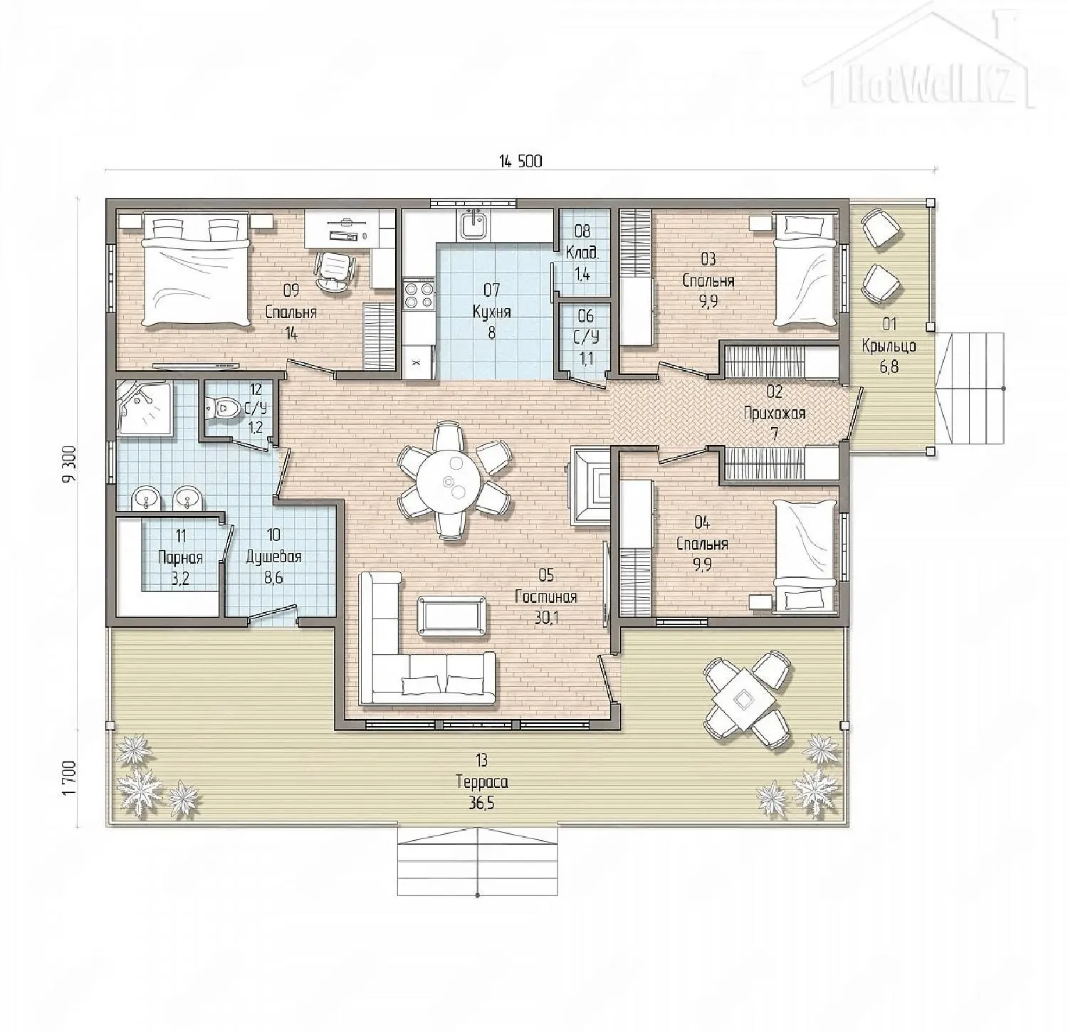 Одноэтажный дом 15 на 11 метров, общей площадью 150 м2, из СИП панелей, с сауной, террасой и спальней на первом этаже.