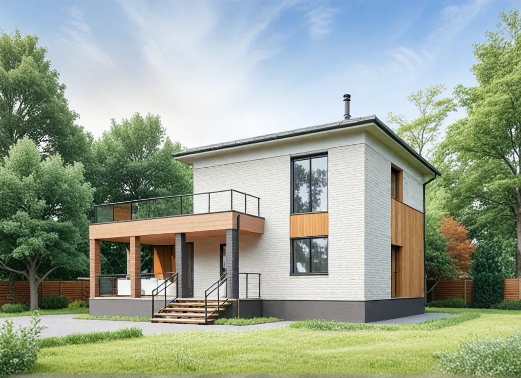 Двухэтажный дом 11 на 11 метров, общей площадью 206 м2, из СИП панелей, с бойлерной, гаражом и террасой.