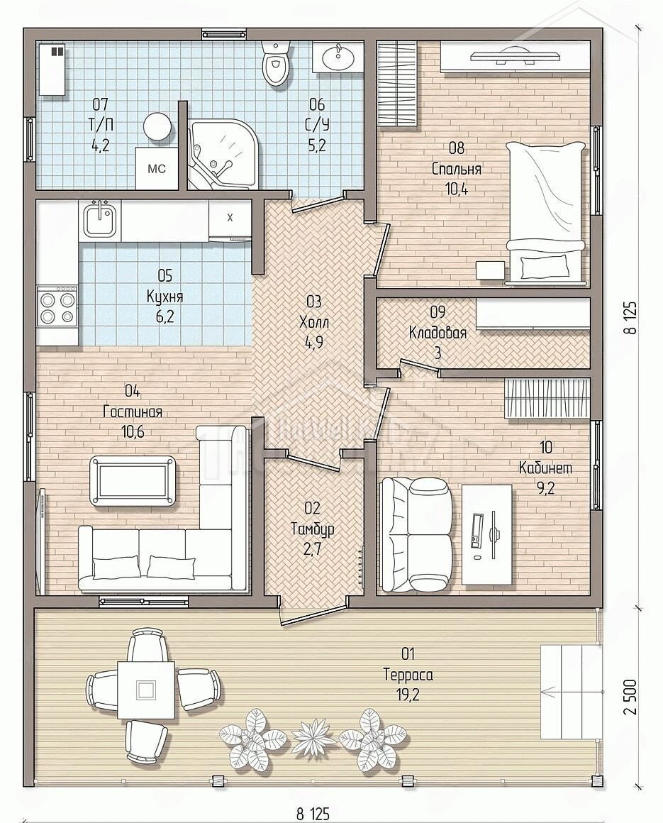 Одноэтажный дом 11 на 8 метров, общей площадью 66 м2, из СИП панелей, с бойлерной, террасой и спальней на первом этаже.