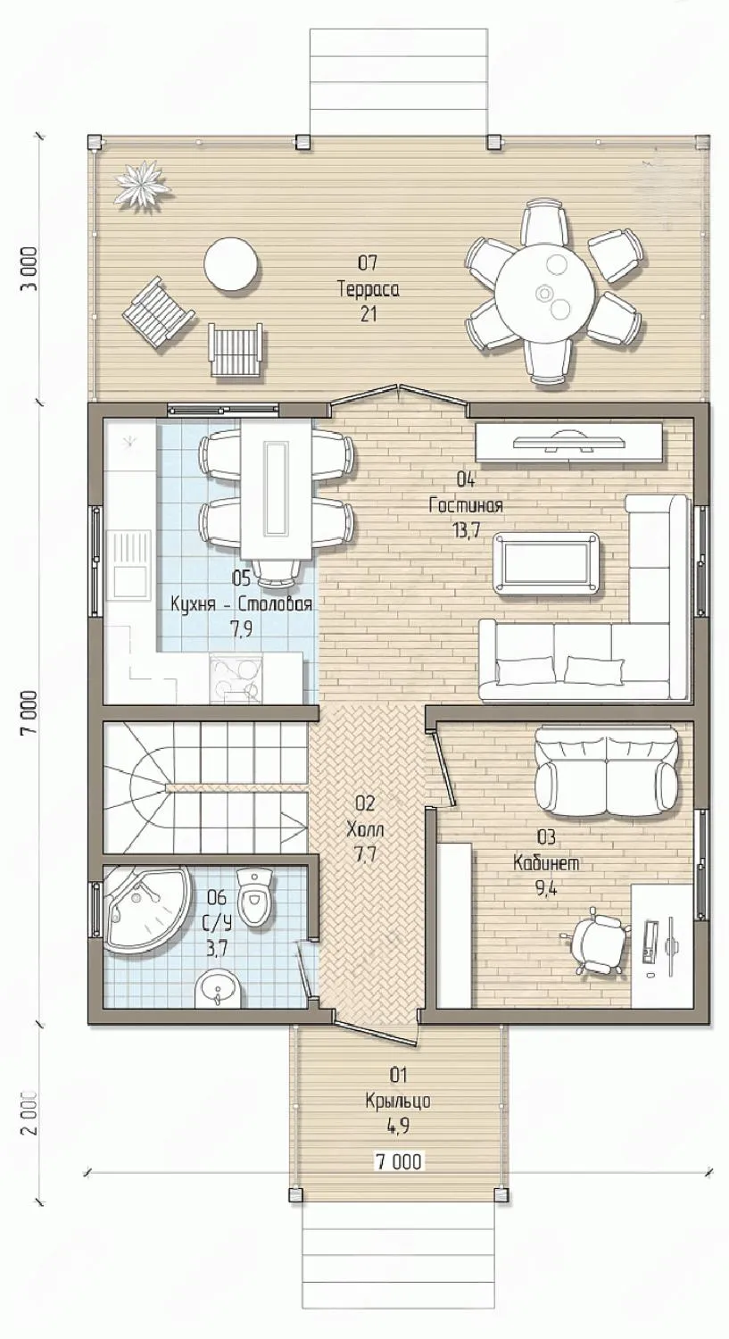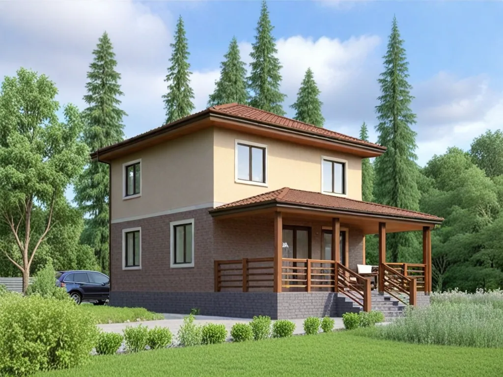 Двухэтажный дом 12 на 7 метров, общей площадью 98 м2, из СИП панелей, с террасой и спальней на первом этаже.