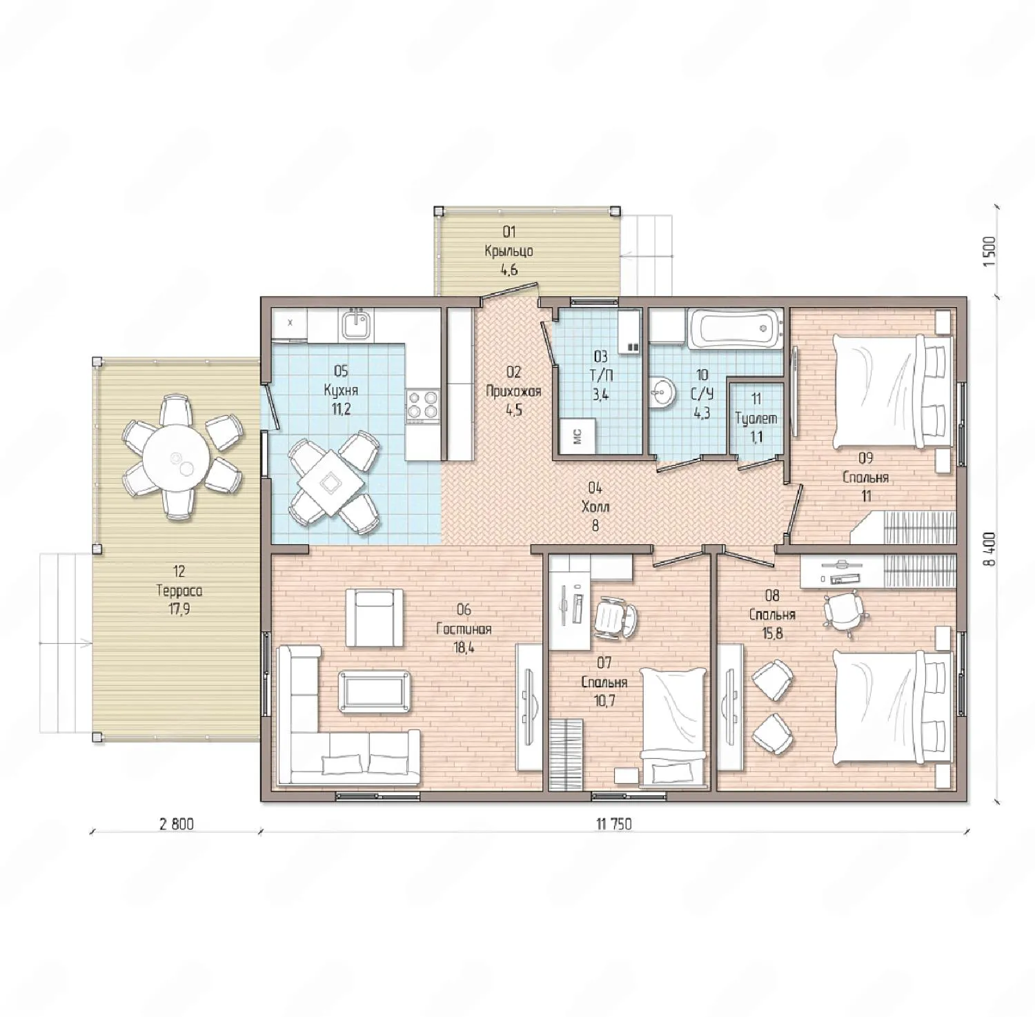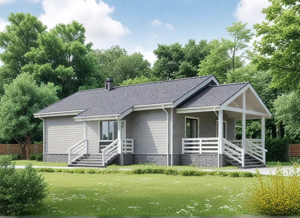 Одноэтажный дом 15 на 10 метров, общей площадью 100 м2, из СИП панелей, с бойлерной, террасой и спальней на первом этаже.