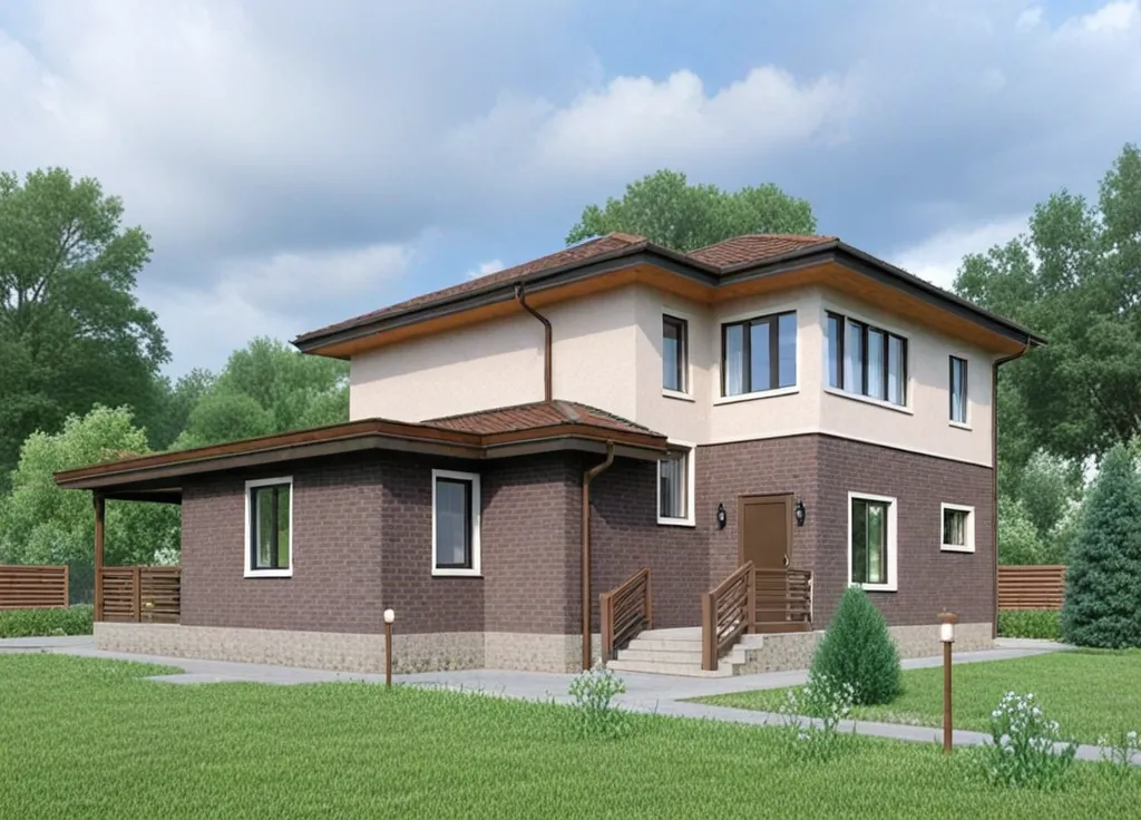 Двухэтажный дом 13 на 12 метров, общей площадью 204 м2, из СИП панелей, с бойлерной, террасой, балконом и спальней на первом этаже.