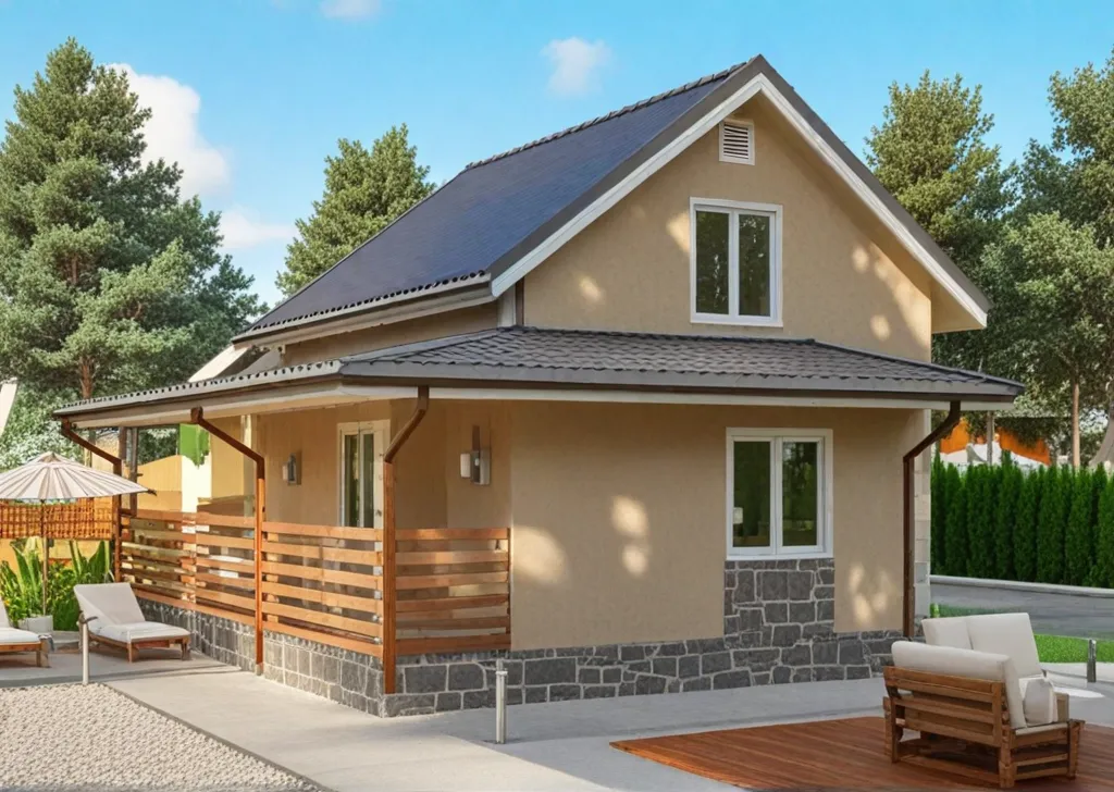 Дом с мансардой 10 на 9 метров, общей площадью 100 м2, из СИП панелей, с сауной и спальней на первом этаже.