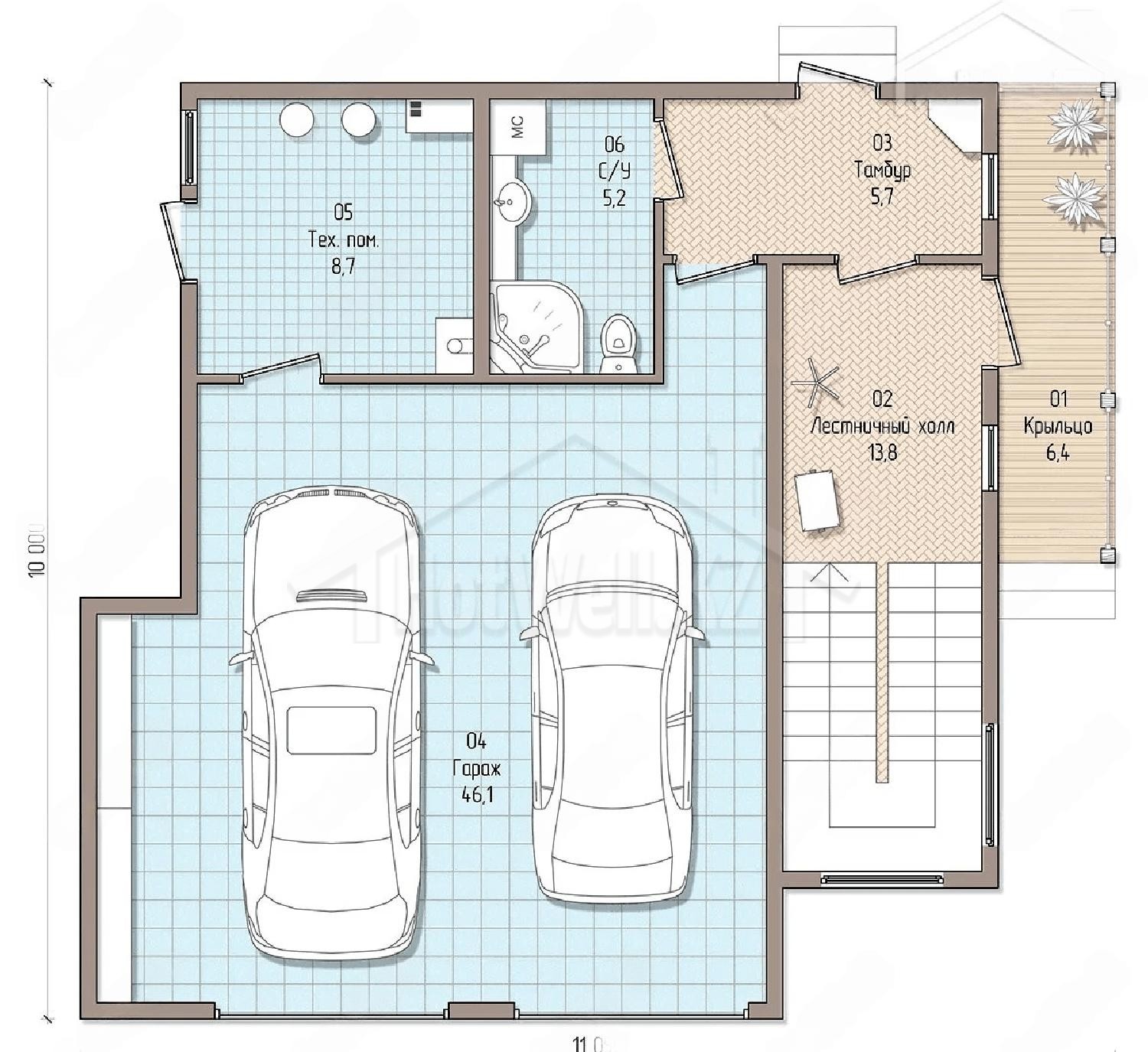Дом с мансардой 11 на 10 метров, общей площадью 191 м2, из СИП панелей, с гаражом, террасой, балконом и вторым светом.