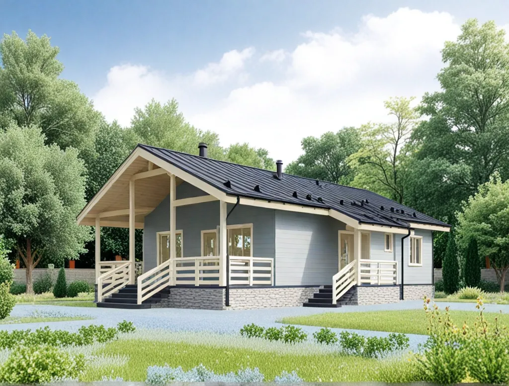 Одноэтажный дом 14 на 10 метров, общей площадью 124 м2, из СИП панелей, с бойлерной и террасой.