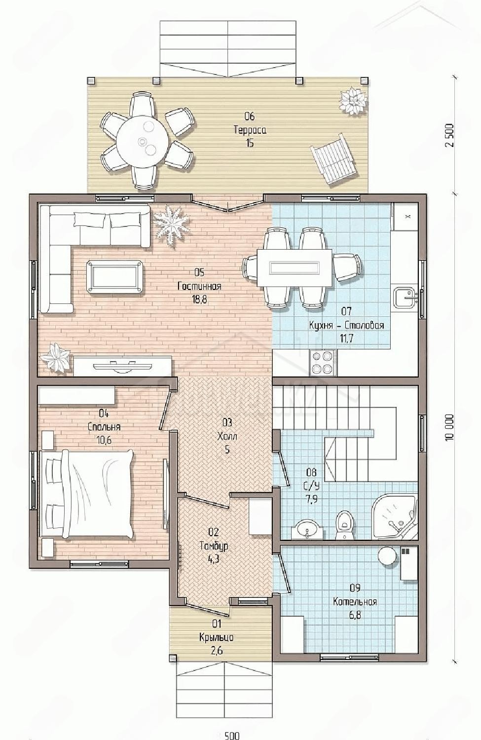 Двухэтажный дом 9 на 13 метров, общей площадью 170 м2, из СИП панелей, с бойлерной, террасой и спальней на первом этаже.