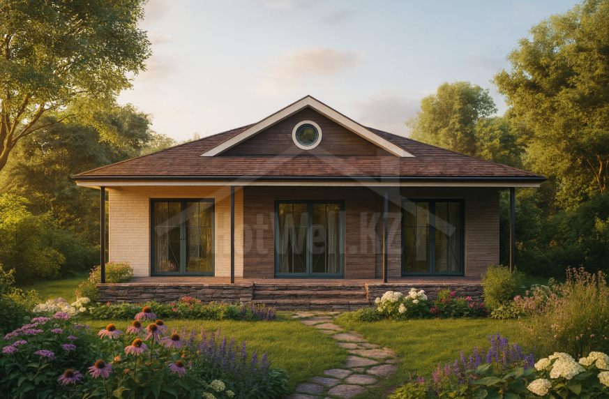 Проект предусматривает четырёхскатную крышу, которая отличается надежностью и устойчивостью к погодным условиям. Такая конструкция хорошо отводит осадки и придает дому аккуратный и гармоничный внешний вид.