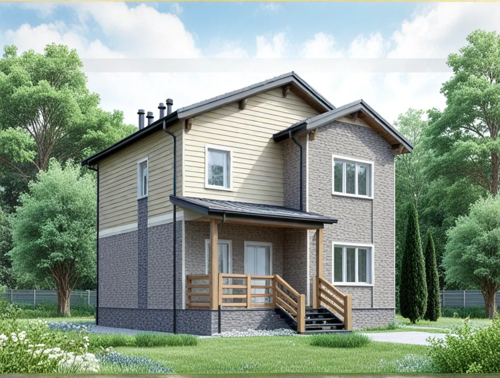 Двухэтажный дом 9 на 8 метров, общей площадью 113 м2, из СИП панелей, со спальней на первом этаже.