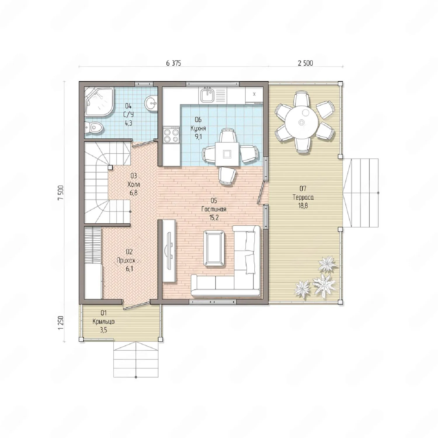 Двухэтажный дом 9 на 9 метров, общей площадью 117 м2, из СИП панелей, с террасой.