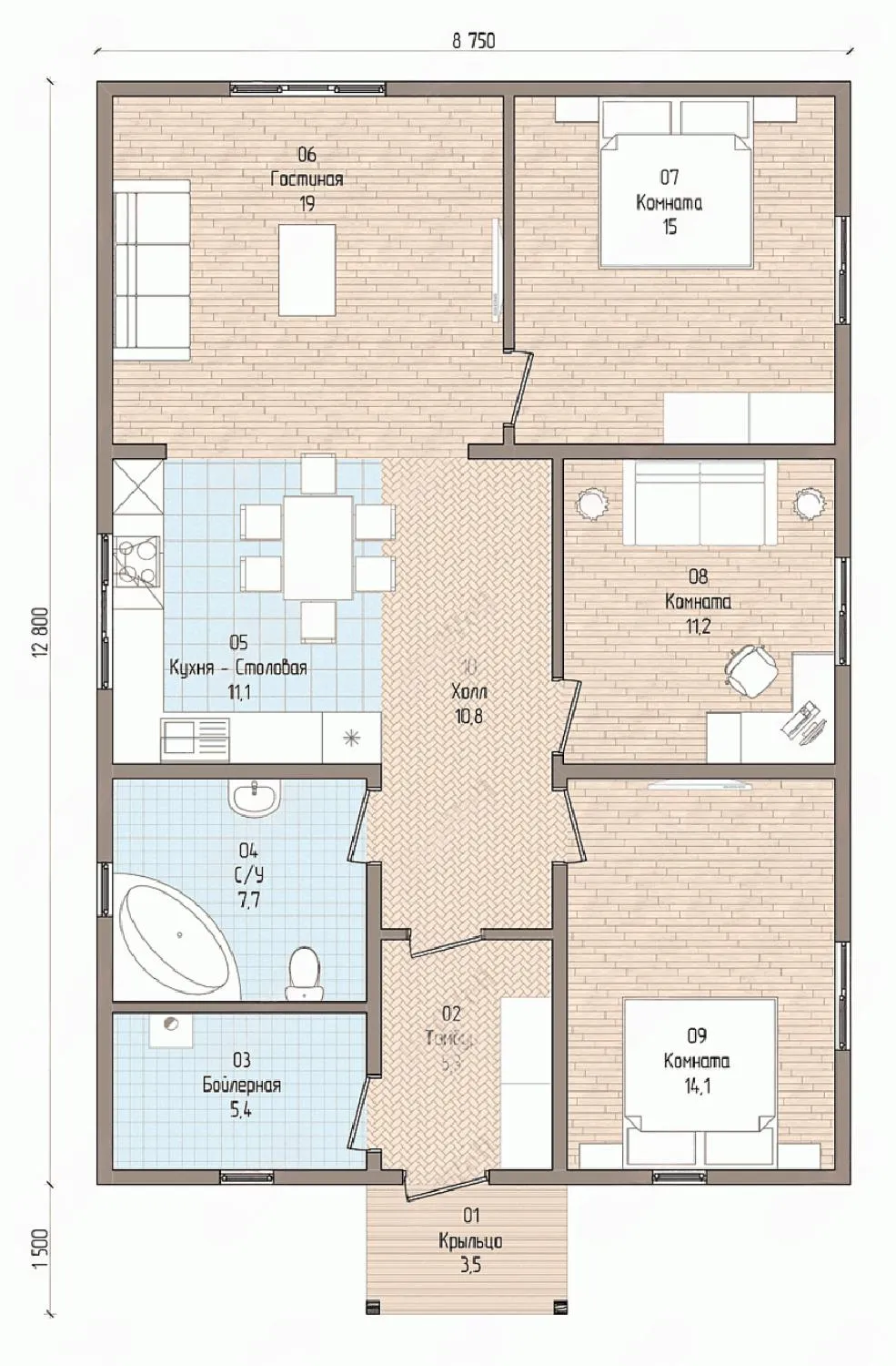 Одноэтажный дом 14 на 9 метров, общей площадью 116 м2, из СИП панелей, с бойлерной и спальней на первом этаже.