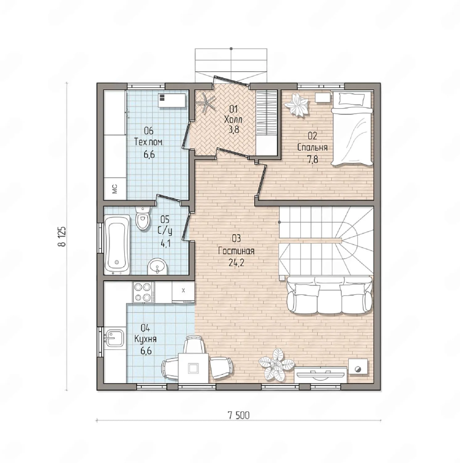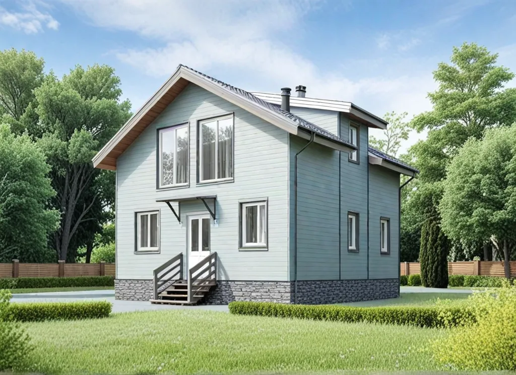Дом с мансардой 8 на 8 метров, общей площадью 122 м2, из СИП панелей, с бойлерной и спальней на первом этаже.