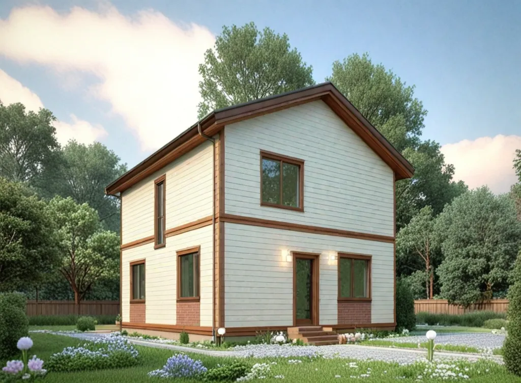 Двухэтажный дом 8 на 8 метров, общей площадью 126 м2, из СИП панелей, с бойлерной и спальней на первом этаже.